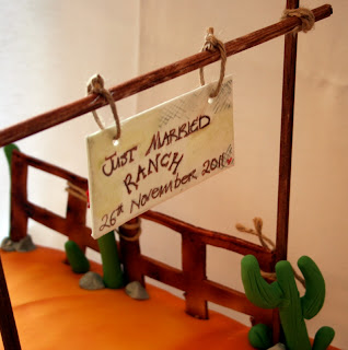 This cake near gave me a nervous breakdown, I think it was the preciseness of the drawing we were given. The bride and groom loved it and that is what we aim for. The cake is a 24 x 12" vanilla and raspberry cake, triple layered with raspberry jam and vanilla buttercream. The cake was then covered in fondant and decorated with sugar fences and cacti. The sign is also made from sugar and we did have sugar posts, for the sign, but the weather went against us and it just didn't set.